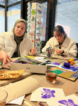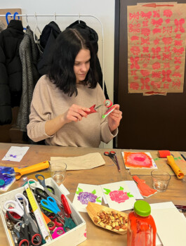 Künstlerischer Abschluss im Kunsthaus-Atelier: Alle Teilnehmenden gestalten je zwei Postkarten – eine für sich oder um sie nach Hause zu schicken, eine fürs Kunsthaus. Diese Karten werden im Dezember im Kunsthaus ausgestellt.