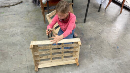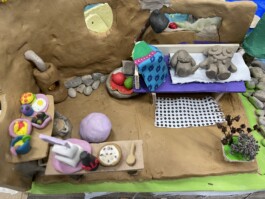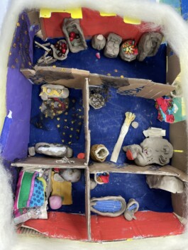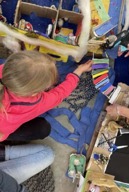 Man hörte: „Kann ich bitte noch Ton haben?“ „Ich brauche eine Zange um die Obstkiste zu zerlegen.“ „Wie kann ich das kleben?“ „Darf ich diese Pappe nehmen?“ Und „Guck mal, das habe ich gerade gemacht.“ „Kannst du mir ein kleines Kissen für das Bett nähen?“ „Ich brauche noch mehr rote Farbe.“ „Mir gefällt dein Haus, es sieht so gemütlich aus.“